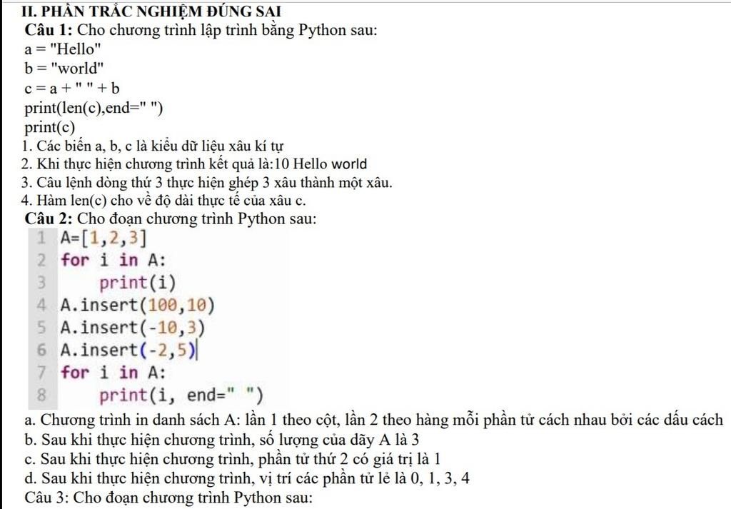 Câu 1: Cho chương trình lập trình bằng Python sau: