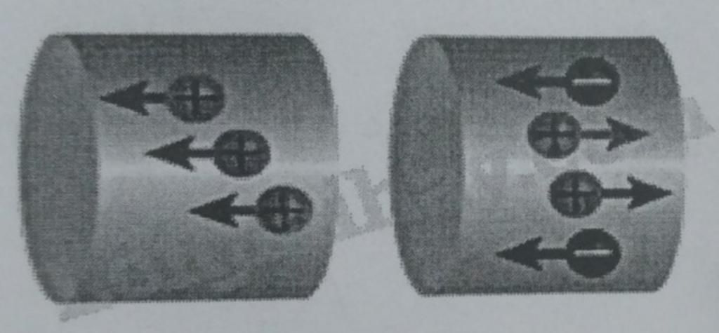 Xét các điện tích dương và âm có cùng độ lớn điện tích, đều dịch chuyển có hướng và theo phương ngang với cùng tốc độ ở hai vùng dẫn điện khác nhau như hình trên. Gọi I1 là cường độ dòng điện do các điện tích dịch chuyển tạo ra trong vùng đầu tiên bên trái, I2 là cường độ dòng điện tương ứng trong vùng tiếp theo (tính từ trái sang phải). Chọn câu đúng