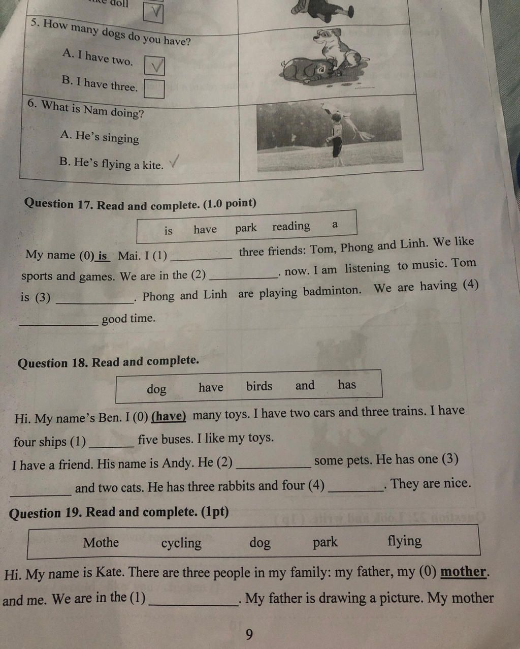 Bài 18: (1) and , (2) has , (3) dog, (4) birds