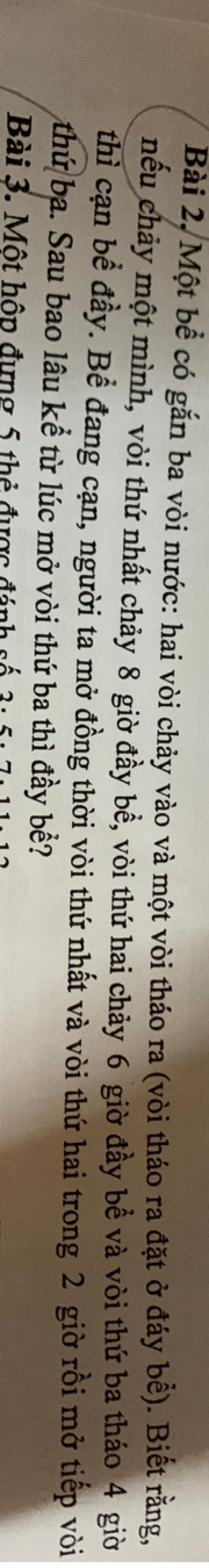 Bài 2. Một bể có gắn ba vòi nước: hai vòi chảy vào và một vòi tháo ra (vòi tháo ra đặt ở đáy bể). Biết rằng,