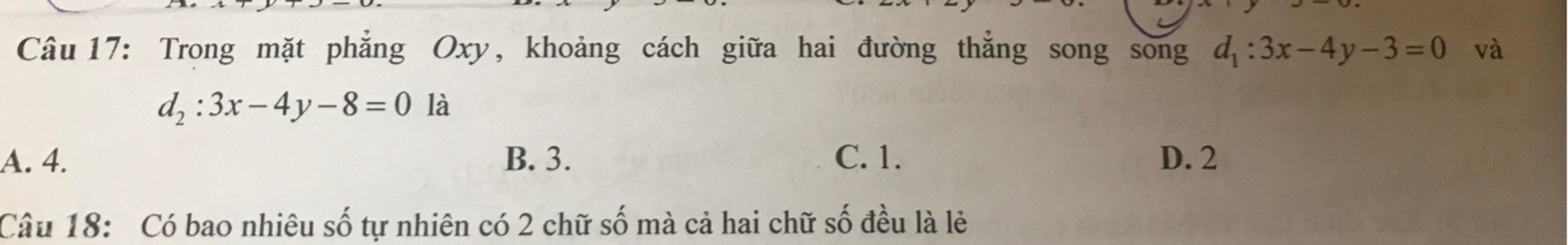 Câu 17: Trong mặt phẳng Oxy, khoảng cách giữa hai đường thẳng song song d:3x-4y-3=0 và
