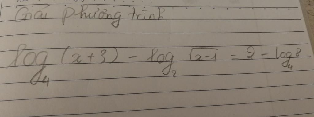 =$\frac{1}{2}$`log`$_{2}$(x+3)-$\frac{1}{2}$$\log$$_{2}$(x-1)=2-$\frac{3}{2}$ =$\frac{1}{2}$$\log$$_{2}$($\frac{x+3}{x-1}$)=$\frac{1}{2}$ $\Rightarrow$$\log$$_{2}$($\frac{x+3}{x-1}$)=1 suy ra $\frac{x+3}{x-1}$=2 = x+3=2x-2 suy ra x=5