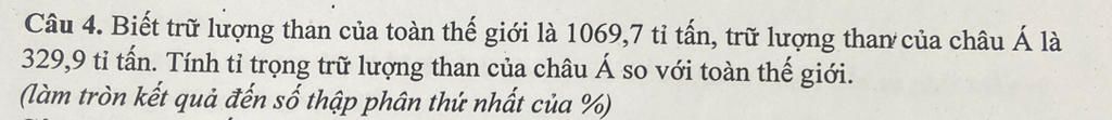 `->` Tỉ trọng trữ lượng than của châu `Á` so với toàn thế giới là: