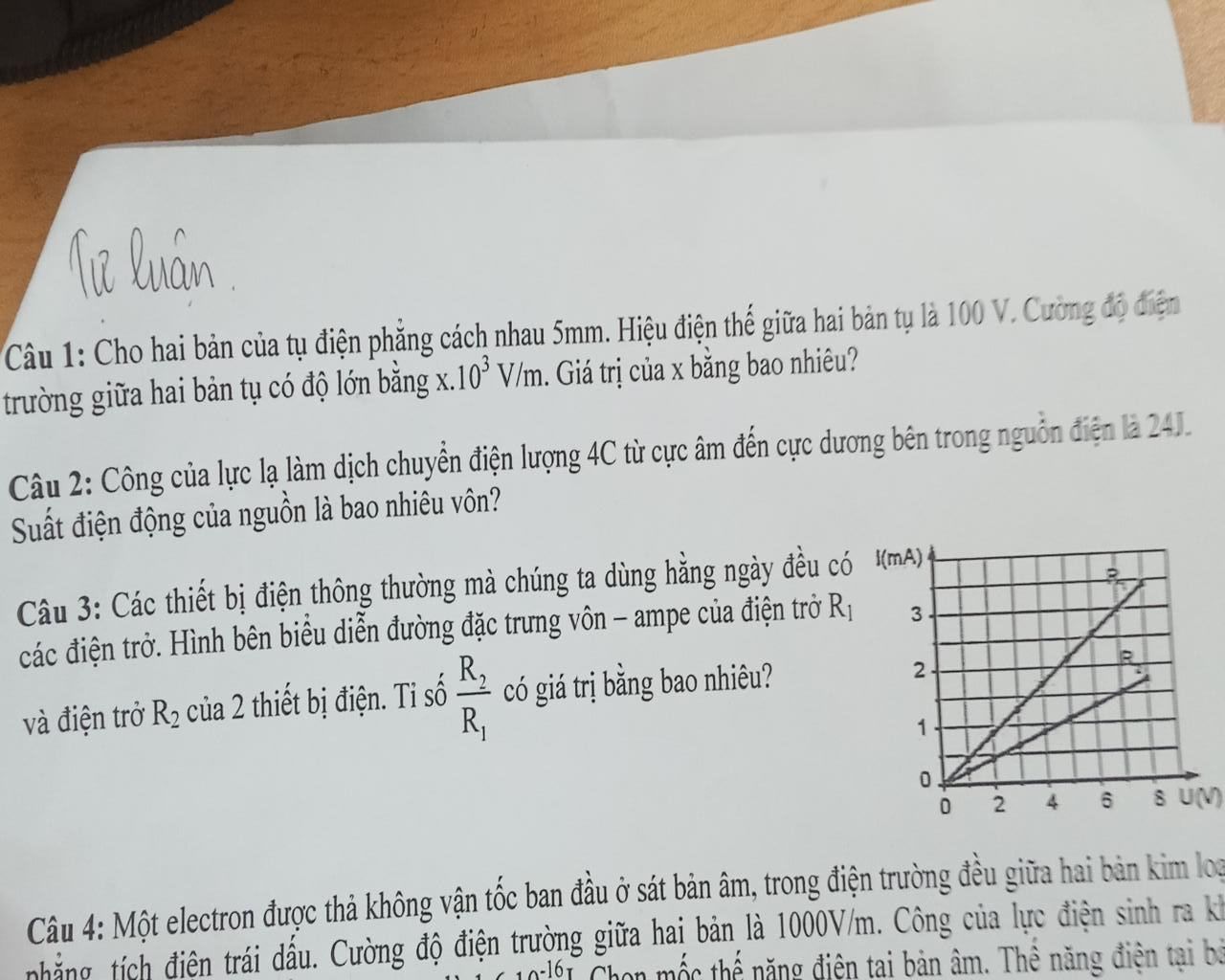 E = \dfrac{U}{d} = \dfrac{{100}}{{\dfrac{5}{{1000}}}} = 20000\left( {V/m} \right) = {20.10^3}\left( {V/m} \right)\\