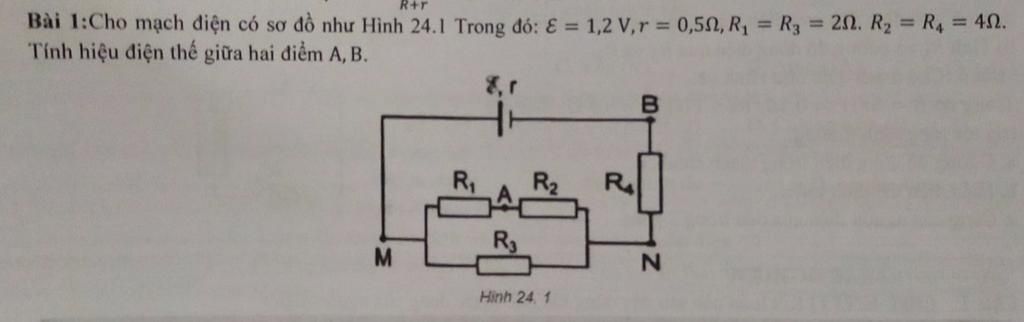 \([(R_1ntR_2)//R_3]ntR_4\\R=\dfrac{(R_1+R_2)R_3}{R_1+R_2+R_3}+R_4=5,5(\Omega)\\\Rightarrow I=\dfrac{\mathcal{E}}{R+r}=0,2(A)=I_4=I_{123}\\\Rightarrow U_4=0,8(V)\\U_{123}=I_{123}.R_{123}=0,3(V)=U_{3}\\\Rightarrow I_3=\dfrac{U_3}{R_3}=0,15(A)\\\Rightarrow I_1=I_2=I_{12}=I-I_3=0,05(A)\\\Rightarrow U_2=0,2(A)\\\Rightarrow U_{AB}=U_{AN}+U_{NB}=U_2+U_4=1(A)\)