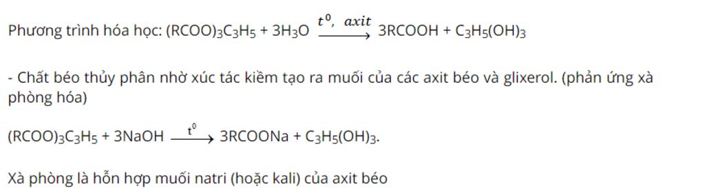 - Đun nóng chất béo với nước , có axit làm xúc tác , chất béo tác dụng với nước tạo ra glixerol và các axit béo ( phản ứng thủy ngân ).
