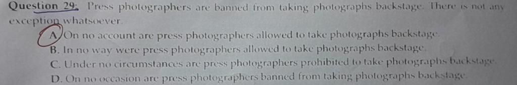 `**` Ý nghĩa ở đây muốn nói rằng : Nhiếp ảnh gia báo chí chỉ bị cấm chụp ảnh ở hậu trường chứ không phải không có trường hợp nào , hoặc trong mọi trường hợp , hoặc không còn cách nào . Chúng ta có thể giải thích/ xin phép để được vào chụp nhưng " với bất kì lí do nào" cũng không được phép chụp. ( Dựa vào : There is not any exception whatsoever : Không có bất kỳ ngoại lệ nào cả)
