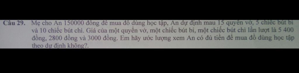 An có đủ tiền để mua 15 quyển vở, 5 Cây bút bi, 10 cây bút chì vì em ước lượng ( 15 x 5400 ) + ( 5 x 5400 ) + ( 10 x 3000 ) < 150 000 nghìn.
