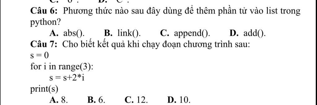 Câu 7: B (s = 0 + 2 + 4 vì i chạy từ 0 đến 2)