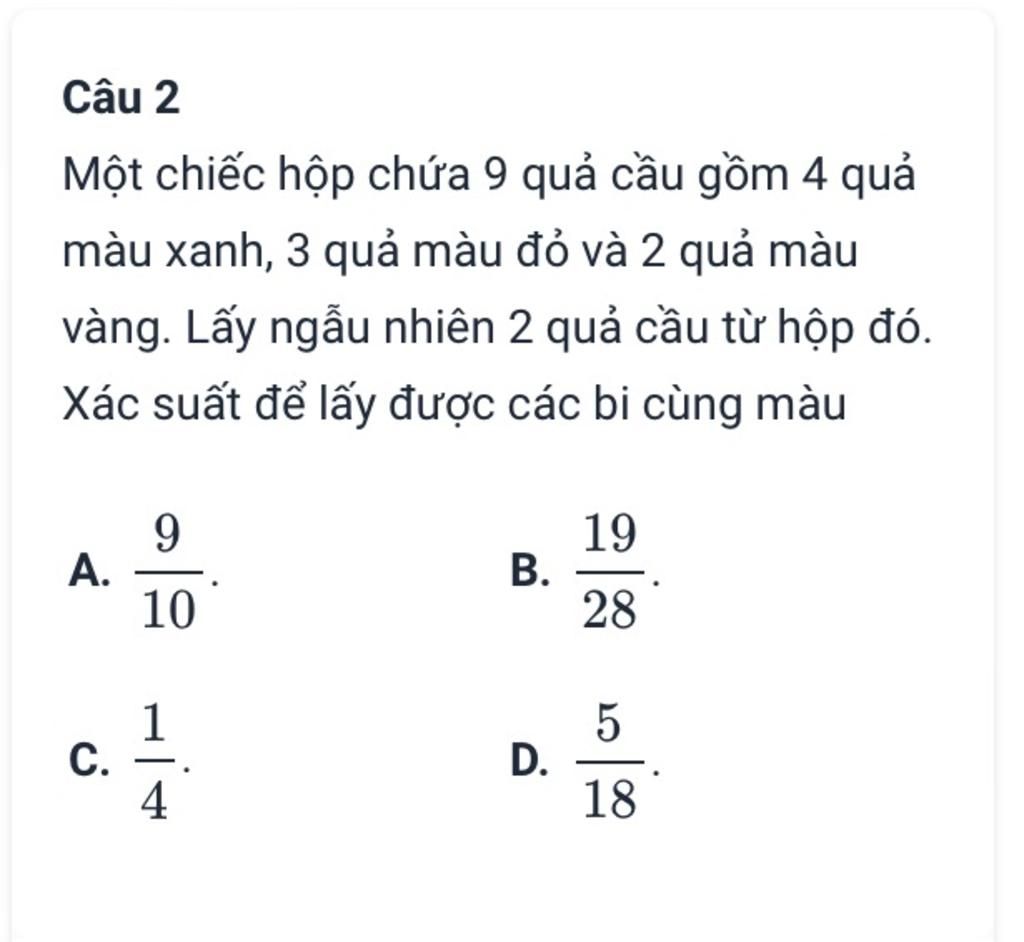 Gọi `A` là biến cố lấy ngẫu nhiên `2` quả cầu từ hộp