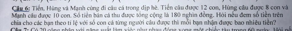 Vậy `:` số tiền ba bạn Tiến, Hùng và Mạnh nhận được lần lượt là `108` (nghìn đồng) `;` `72` (nghìn đồng) `;90` (nghìn đồng)