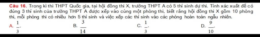Câu 16. Trong kì thi THPT Quốc gia, tại hội đồng thi X, trường THPT A có 5 thí sinh dự thi. Tính xác xuất đề có