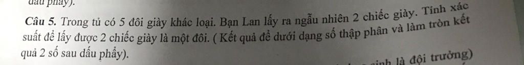 Câu 5. Trong tủ có 5 đôi giày khác loại. Ban Lan lây ra ngẫu nhiên 2 chiếc giày. Tính xác