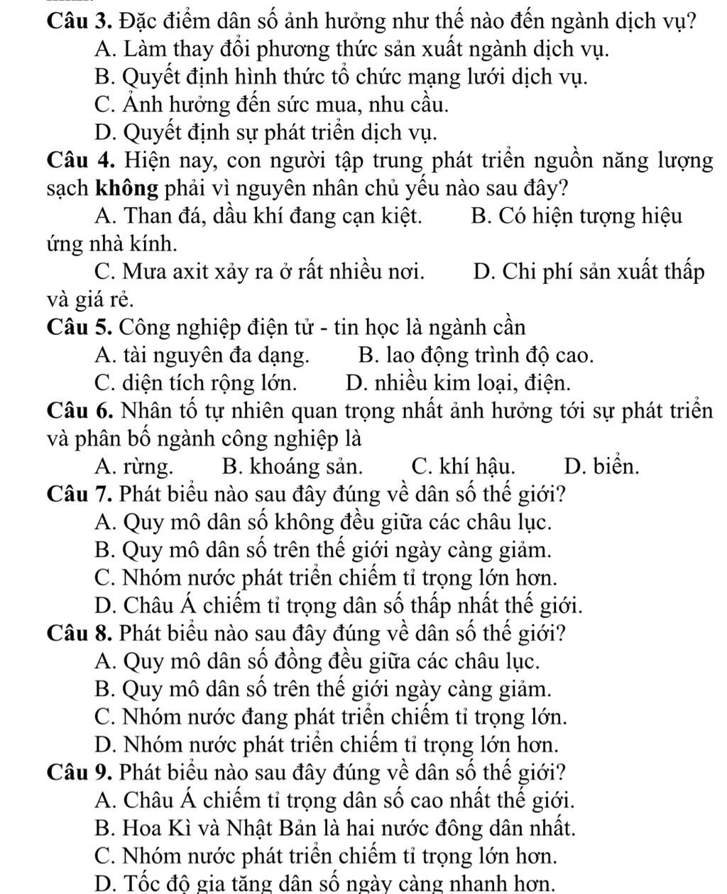 Câu 3. Đặc điểm dân số ảnh hưởng như thế nào đến ngành dịch vụ?