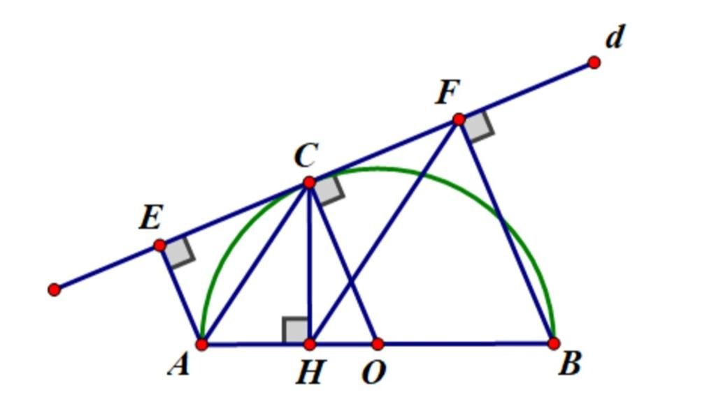 Cho nửa đường tròn tâm O đường kính AB. Điểm C di động trên nửa đường tròn (C khác A và B). Qua C vẽ tiếp tuyến d với nửa đường tròn. Gọi E, F là hình chiếu của A, B xuống d và H là chân đường vuông góc hạ từ C xuống AB.