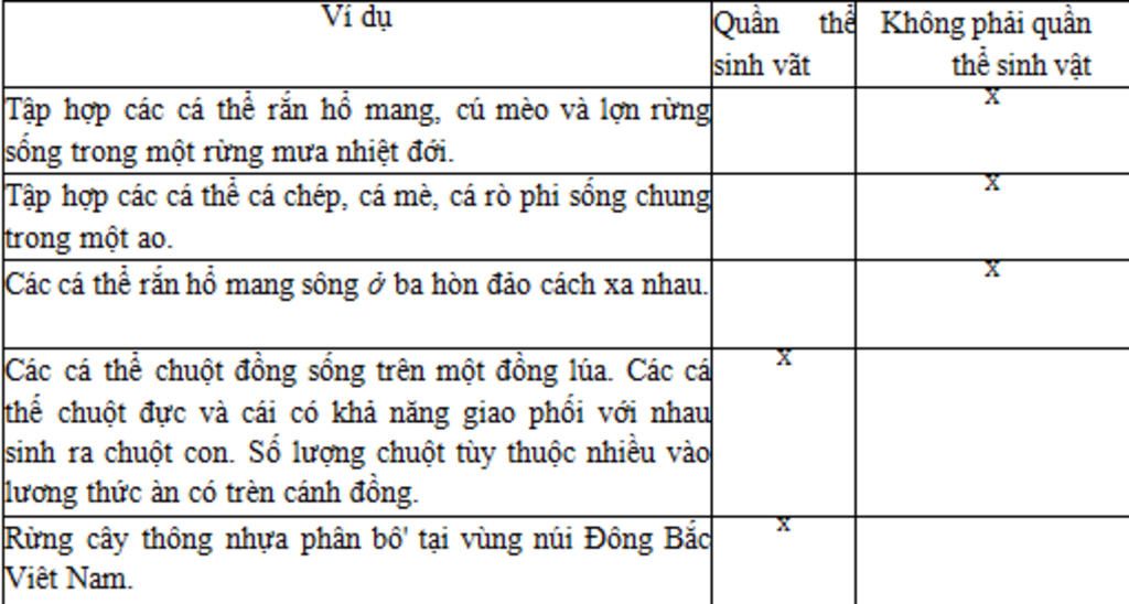 Quần thể sinh vật là tập hợp những cá thế cùng loài, sinh sống trong một khoáng không gian nhất định, ở một thời điếm nhất định. Những cá thể trong quần thể có khả năng sinh sản tạo thành những thế hệ mới.
