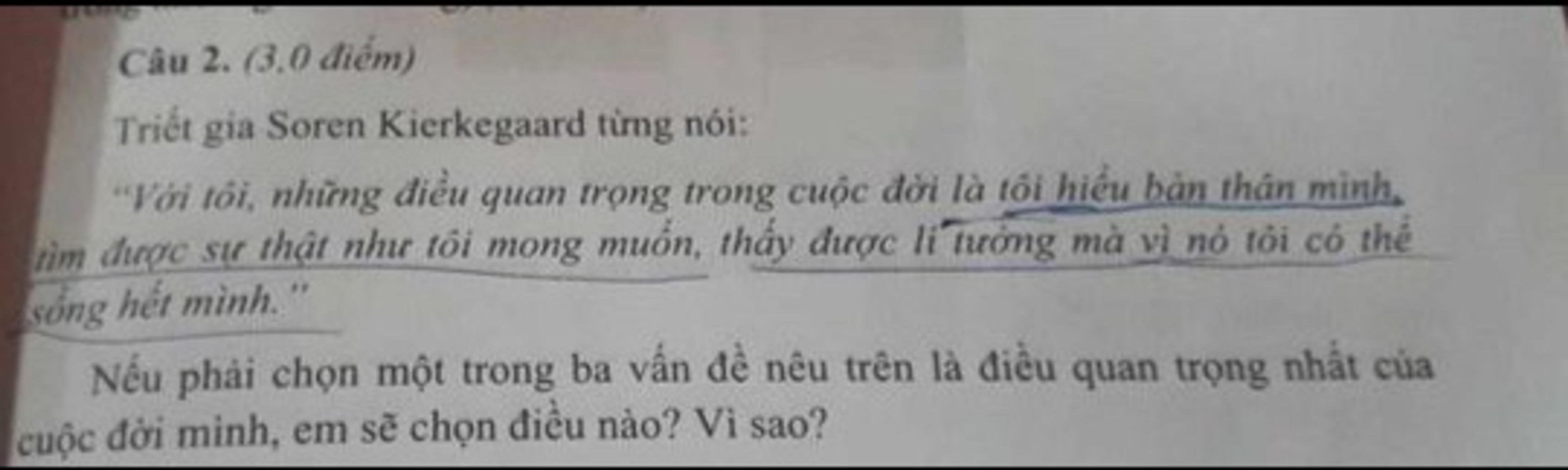 `⇒` Đúng như triết gia Soren Kierkegaard đã từng nói, việc "hiểu chính bản thân mình" là một việc vô cùng quan trọng và đáng được mọi người quan tâm. Tôi cũng vậy, đối với suy nghĩ của một người tuy chưa thể được cao rộng hay mang tầm ảnh hưởng sâu xa như nhà triết gia ấy, nhưng đối với cuộc đời của một con người mang trong mình lòng tự trọng, tôi luôn cho rằng quyết định lớn nhất và cũng quan trọng nhất, ưu tiên được lựa chọn là phải hiểu bản thân mình trước. Bởi ắt, khi ta hiểu chính bản thân mình rồi, khi ấy ta mới thấy và tìm được những sự thật mà mình mong muốn, thấy được những lí tưởng sống cao đẹp của bản thân. Cũng từ đó mà ta biết sống sao cho hợp lí, sống sao cho vừa đáp ứng được nhu cầu của bản thân mà cũng góp phần xây dựng, cống hiến cho xã hội. Bởi khi, ta hiểu bản thân mình, khi ấy ta sẽ có thể nhìn nhận ra được những ưu điểm và điểm mạnh riêng. Từ đó, tập trung phát huy và phát triển chúng lên tới một tầng cao mới `-` một tầng lớp mang những ý nghĩa và giá trị lớn hơn... Ngược lại, ta cũng có thể nhìn nhận ra được những khiếm khuyết, những nhược điểm và khuyết điểm cần sửa chữa ở bản thân. Khi ấy, ta có thể kết đúc và rút ra được nhiều những kinh nghiệm sống để có thể khắc phục và sửa chữa những lỗi sai. Đưa ra được những định hướng phù hợp cho bản thân rồi, dần ta sẽ nhìn nhận và thấy được những bổn phận và trách nhiệm của mình về việc xây dựng và phát triển xã hội, cộng đồng hơn `-` vạch đích của sự thấu hiểu chính bản thân mình.