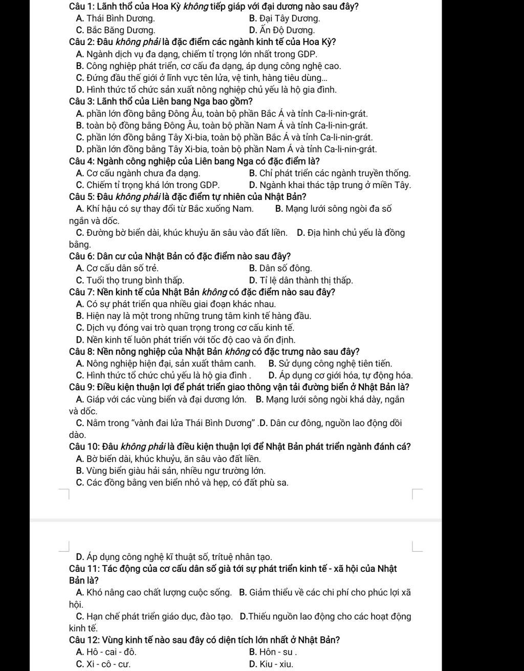 Câu 2: Đâu không phải là đặc điểm các ngành kinh tế của Hoa Kỳ?
