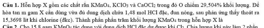 15,3698 lít khí chlorine (đkc). Thành phần phần trăm khối lượng KMnO4 trong hỗn hợp X l ...