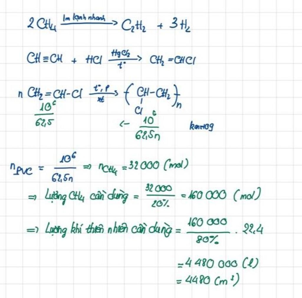 Nếu hiệu suất của toàn bộ quá trình điều chế là 20%, muốn điều chế được 1 tấn PVC thì thể tích khí thiên nhiên (chứa 80% metan) ở điều kiện tiêu cần dùng là bao nhiêu m3?
