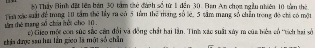 b) Thầy Bình đặt lên bàn 30 tấm thẻ đánh số từ 1 đến 30. Bạn An chọn ngẫu nhiên 10 tấm thẻ.