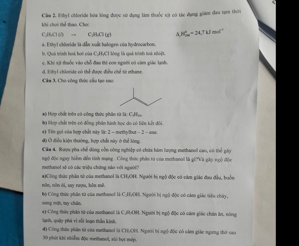 c, Đúng. Quá trình hoá hơi của ethyl chloride lỏng là thu nhiệt nên nhiệt từ môi trường ngoài (da người) bị lấy đi, do đó da lạnh đi.