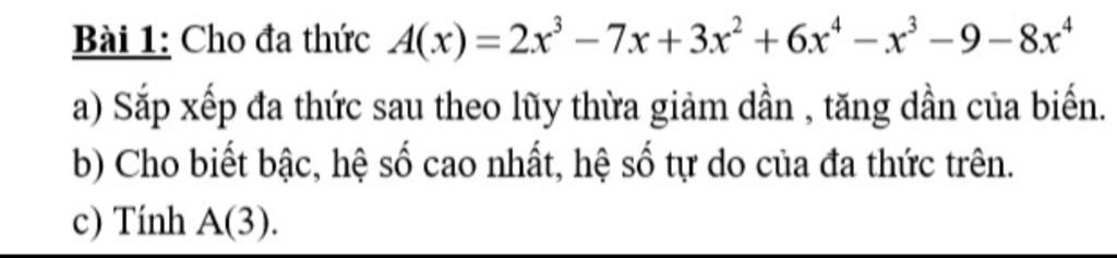 Sắp xếp theo lũy thừa tăng dần là :`-9-7x+3x^2+x^3-2x^4`