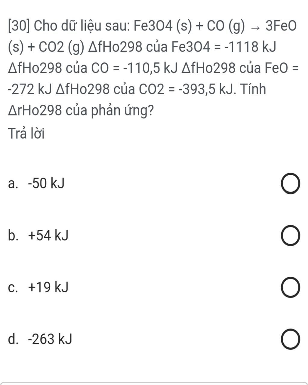 $\rm\Delta_rH^°_{298}=\Delta_fH^°_{298\ (CO_2)}+3\Delta_fH^°_{298\ (FeO)}-\Delta_fH^°_{298\ (CO)}-\Delta_fH^°_{298\ (Fe_3O_4)}\\\kern1,4cm=(-393,5)+3×(-272)-(-110,5)-(-1118)\\\kern1,4cm=19\ (kJ)$