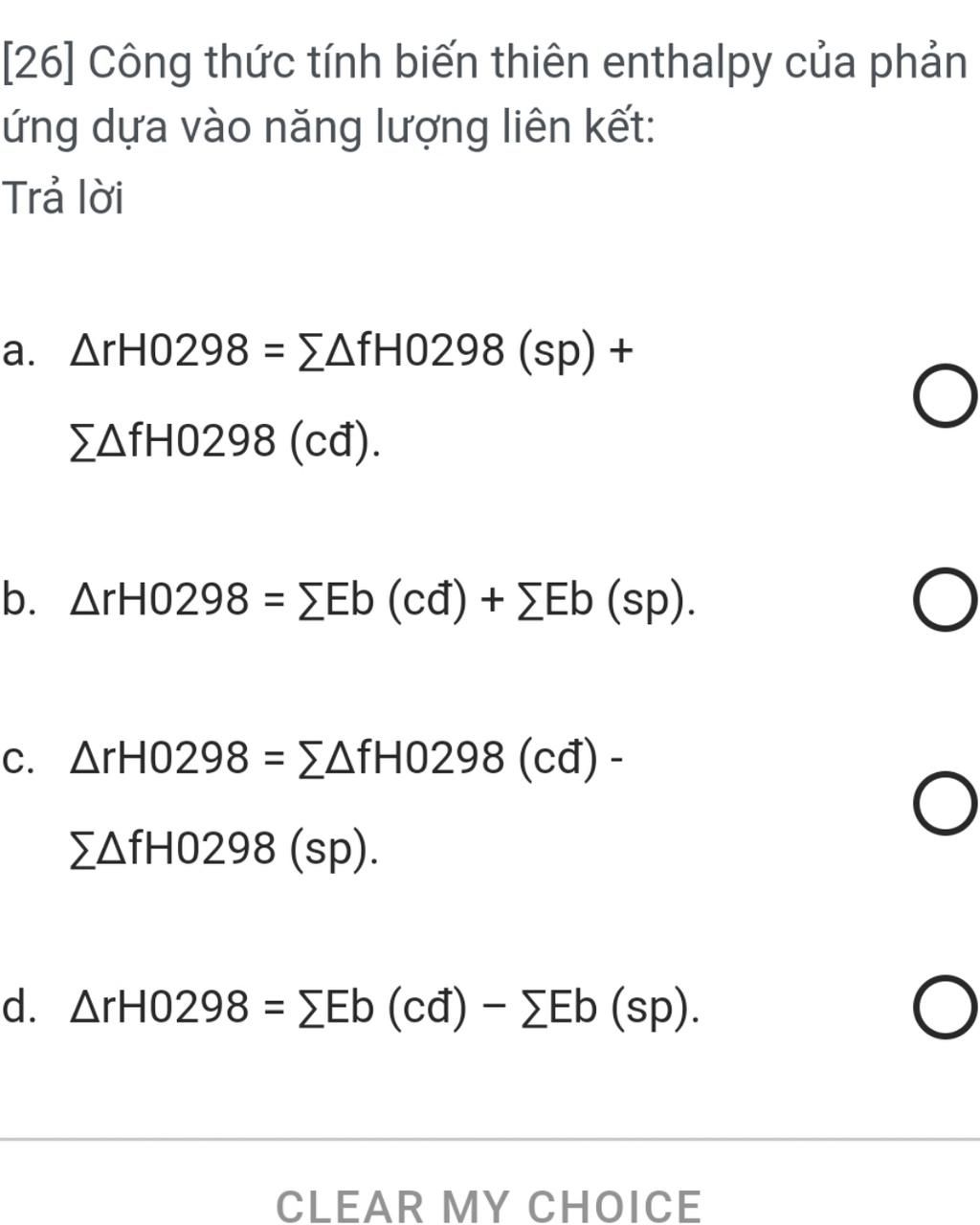$\rm Δ_rH_{298}^0=\sum E_b(c đ)- \sum E_b(sp)$
