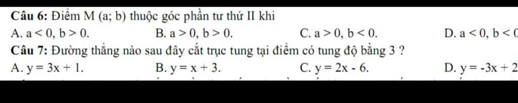 Câu 6: Điểm M (a; b) thuộc góc phần tư thứ II khi
