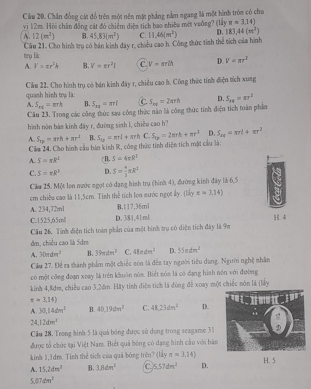 Câu 20. Chân đống cát đổ trên một nên mặt phẳng nằm ngang là một hình tròn có chu