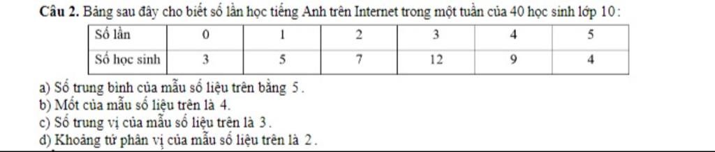Câu 2. Bảng sau đây cho biết số lần học tiếng Anh trên Internet trong một tuần của 40 học sinh lớp 10: