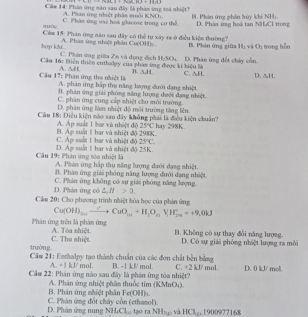 Câu 14: Phản ứng nào sau đây là phản ứng toả nhiệt?
