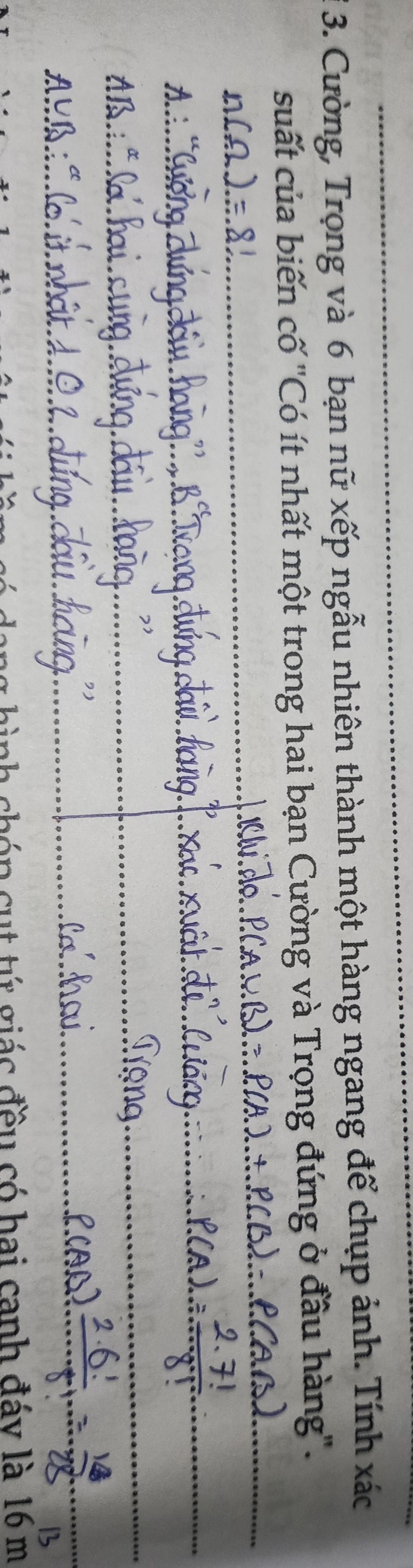 3. Cường Trọng và 6 bạn nữ xếp ngẫu nhiên thành một hàng ngang để chụp ảnh. Tính xác