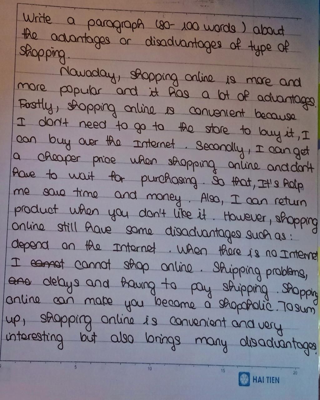 về phần câu cuối cùng là " shopping online is convenient and very interesting " thì từ very nên để trước từ convenient vì nếu để ở mỗi từ interesting thì hơi lạc quẻ chút so với câu " shopping is very convenient and interesting"
