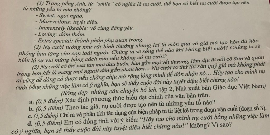 `+` Liệt kê những lợi ích mà nụ cười có thể đem lại cho chúng ta, nhấn mạnh tầm quan trọng của nụ cười trong cuộc sống.