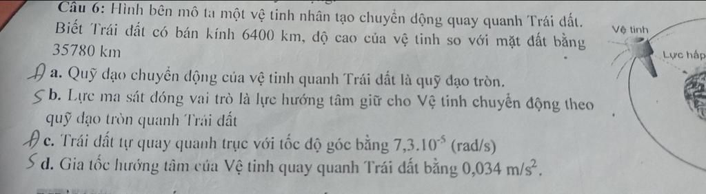 `-` Sửa lại : Lực ma sát đóng vai trò là lực hấp dẫn giữ cho Vệ tinh chuyển động theo quỹ đạo tròn quanh Trái Đất.