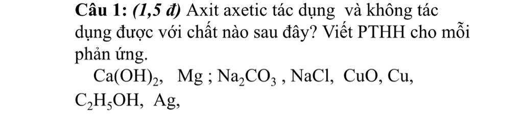 Acetic acid tác dụng với: $\rm Ca(OH)_2, Mg, Na_2CO_3, CuO, C_2H_5OH$.