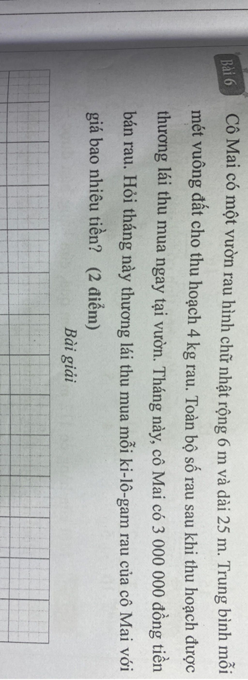 `text{ Thương lái thu mua mỗi kg rau của cô Mai với số tiền là : `