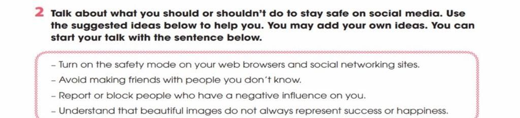 A social network is an online platform, an exchange space with many different functions such as people behaving, exchanging, and interacting with each other in the community. Everyone can easily connect anywhere using means and electronic devices such as computers, phones... which has brought many changes in life. However, today, information technology is developing extremely strongly and becoming more and more popular. Besides, some of the great impacts are on the behavioral culture of each person in cyberspace. Because of its high popularity, people often use it, leading to a problem: behavior in cyberspace. In addition, expressing personal attitudes and thoughts regarding information posted on the internet is also an act of behavior on social networks. Therefore, we need to solve problems such as bullying, grooming, fraud, and cyber threats. We should report or block people who we think have a negative influence on us. We should not access strange links, download pages, or inaccurate information sources. The simplest thing is that we should enable safe modes on our web browsers. People should be confident and understand that online images may be full of very attractive people, BUT not all of them represent beauty, success and happiness in life. Finally, we should be very confident, tell teachers, parents, trusted friends if you think you may be in danger and ensure online safety and health.