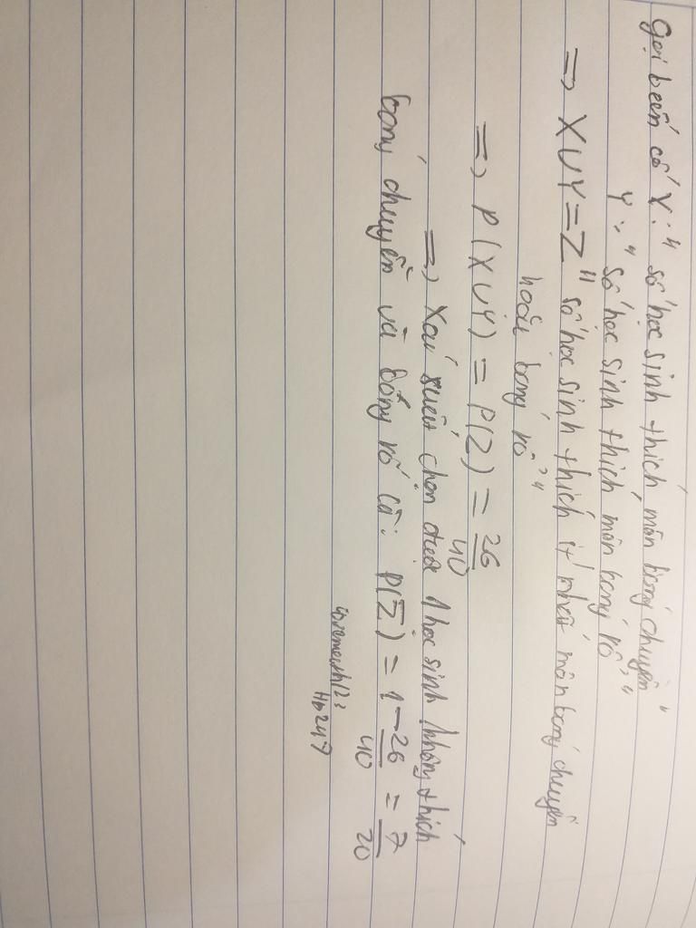 Gọi `AB` là biến cố: Học sinh thích ít nhất một môn bóng chuyển hoặc bóng rổ