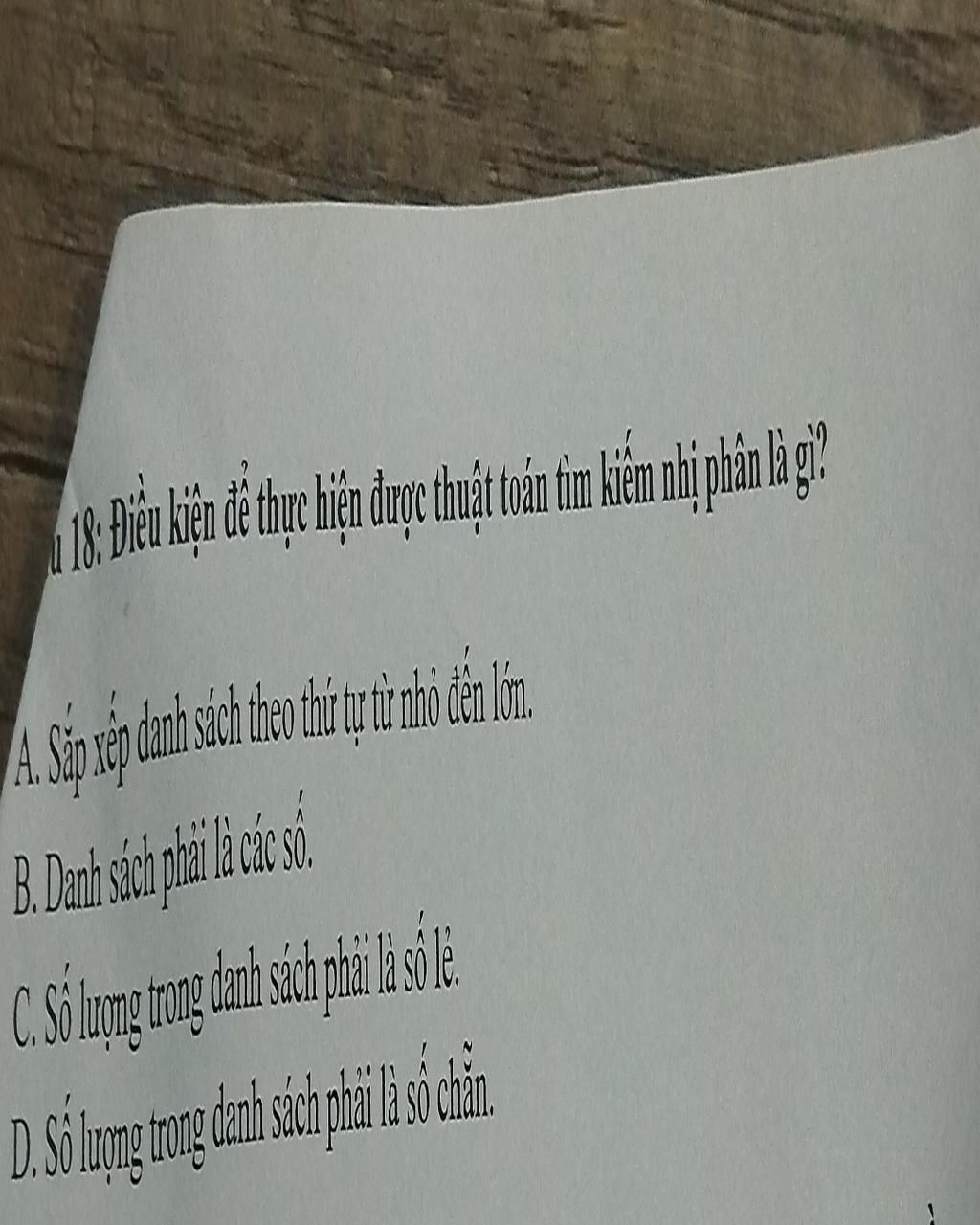 `18`. Điều kiện để thực hiện được thuật toán tìm kiếm nhị phân là gì