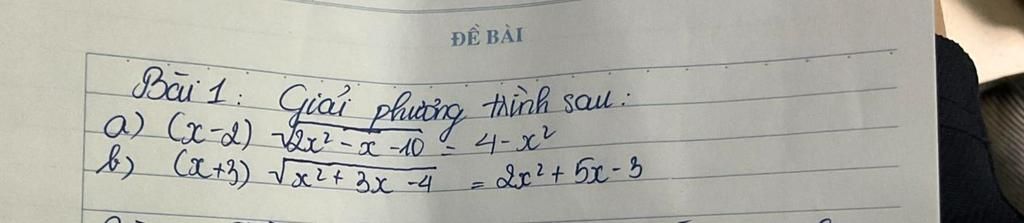 `a, (x-2)\sqrt{2x^2-x-10}=4-x^2` (ĐKXĐ: `x <= 2, x >= 5/2`)