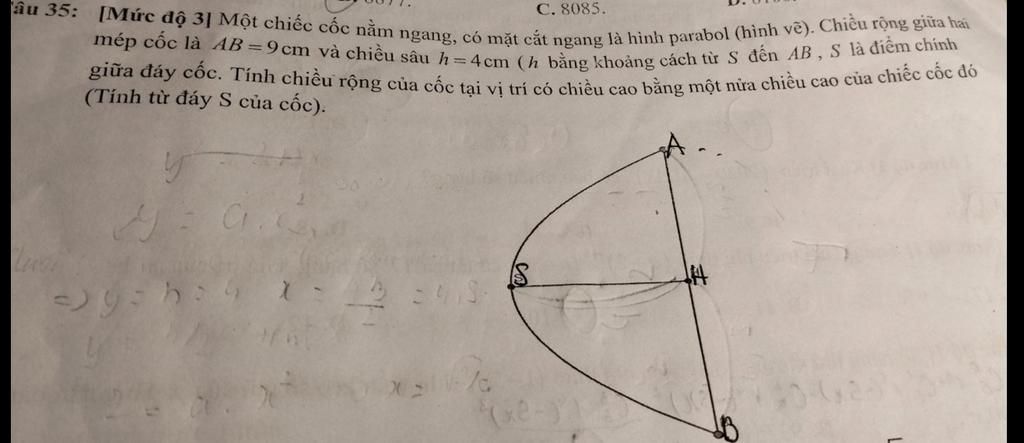 mép cốc là AB=9cm và chiều sâu h=4cm (h bằng khoảng cách từ S đến AB, S là điểm chính
