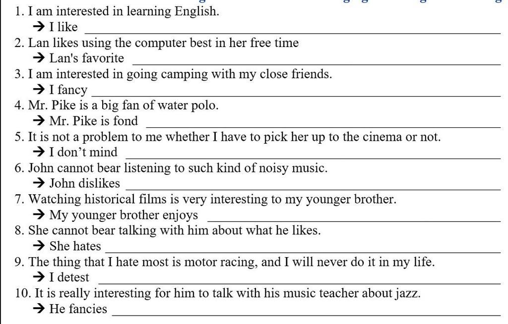 1.l like learning Engligh. 2. Lan's favourite is use then computer in her free time. 3.l fancy going camping with my close friends 4.Mr.pike is fond fo water polo. 5.l don't mind picking her up to the cinema or not. 6.john dislikes listeing to such kind of noisy music. 7. My younger brother enjoys watching historical films 9. She hates talking with him abouy What he likes 10. He fancies talking with his music teachr about jazz. Rút gọn1.l like learning Engligh. 2. Lan's favourite is use then computer in her free time. 3.l fancy going camping with my close friends 4.Mr.pike is fond fo water polo. 5.l don't mind picking her up to the cinema or not. 6.john dislikes listeing to such ki... xem thêm