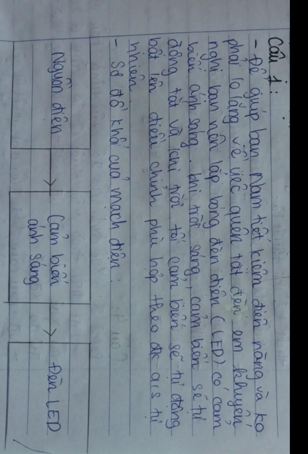 Bạn Nam là một người có tính hay quên, bạn muốn lắp 1 bóng điện thắp sáng ở cổng, vậy em hãy tư vấn cho bạn nên lắp loại cảm biến nào để khi trời sáng đèn tối, khi trời tối đèn sáng và gia đình tiết kiệm được điện năng. Vẽ sơ đồ khối của mạch điện.