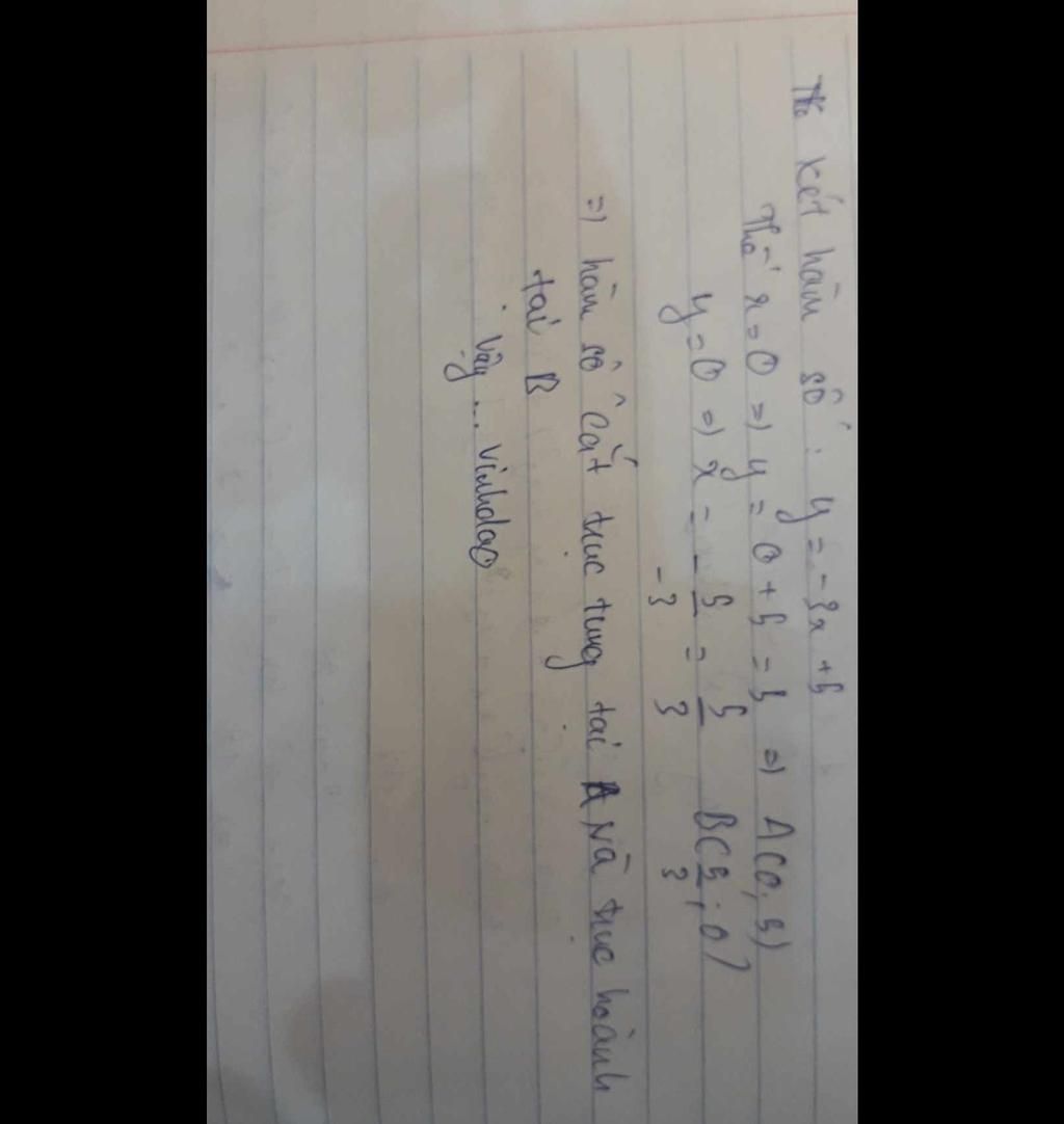 Vậy tọa độ giao điểm của đồ thị hàm số `y = -3x + 5` với trục hoành,trục tung lần lượt là: `(5/3;0); (0;5)`
