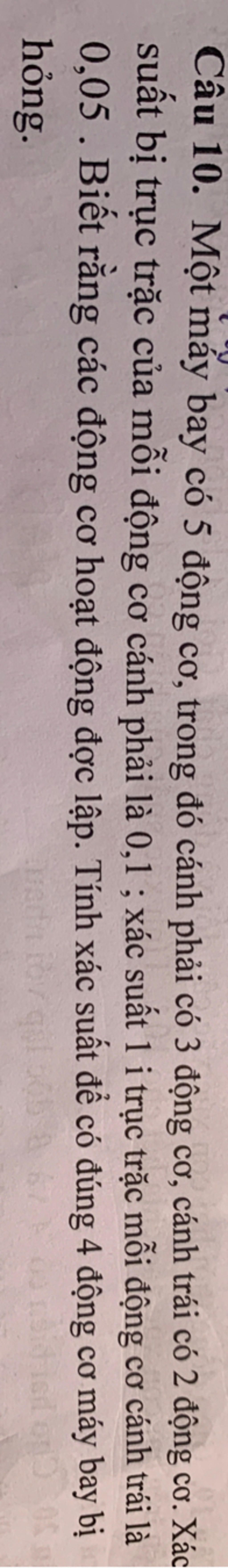 Gọi biến cố `A = ` "Có đúng `4` động cơ bị hỏng"