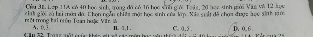 Do đề nói là 1 trong 2 môn, nên khi tính được xác suất hợp của Toán và Văn thì trừ tiếp xác suất học sinh giỏi cả 2 môn.