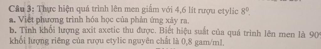 $\rm a.PTHH:C_2H_5OH+O_2 \xrightarrow{men giấm,t^o} CH_3COOH+H_2O$